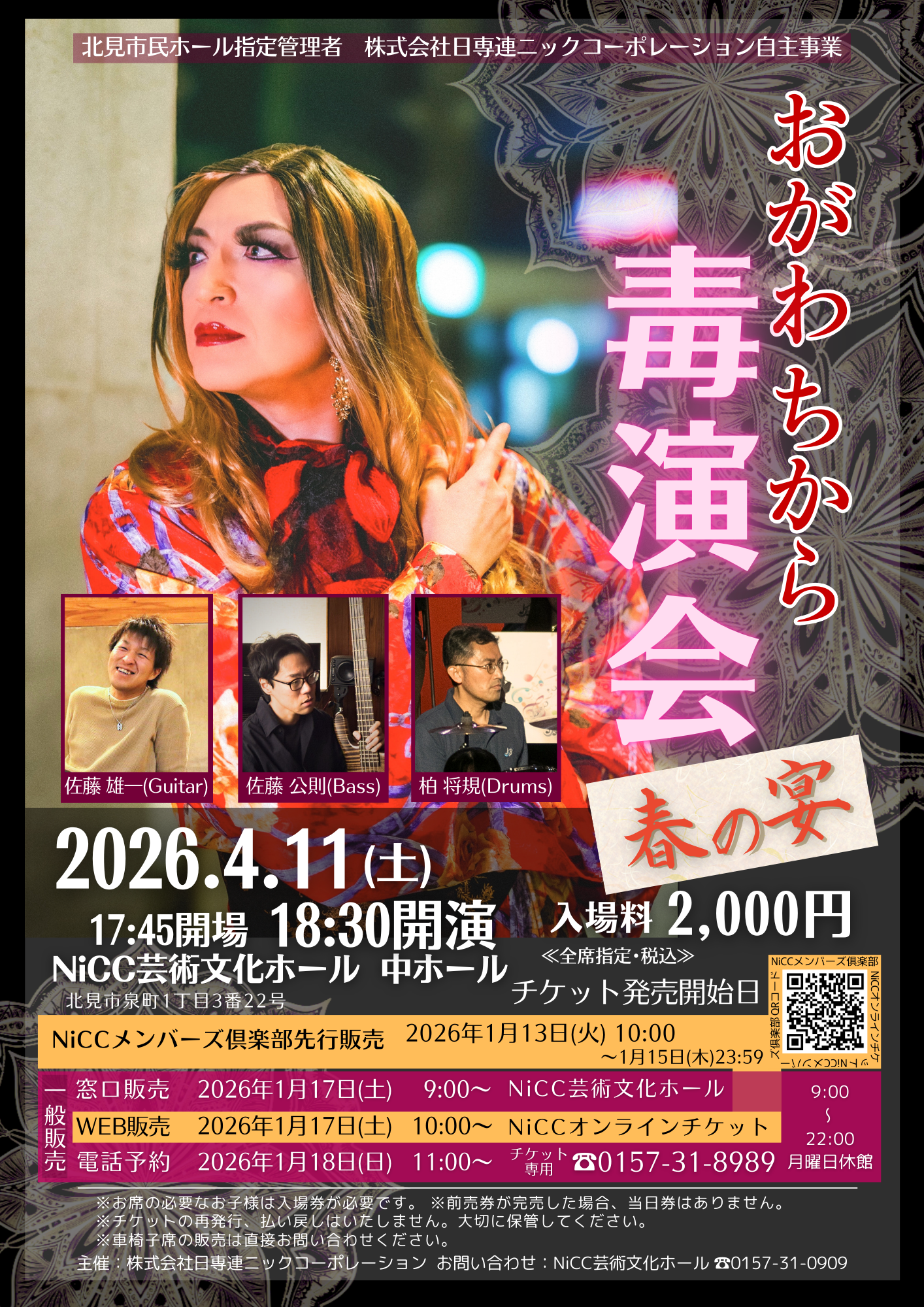 | NiCC芸術文化ホール (北見芸術文化ホール) | ①窓口販売:北見市泉町1丁目3番22号 ②NiCCオンラインチケット: https://p-ticket.jp/kitami-hall ③電話予約:0157-31-8989 〇キョードー・ミュージックソン【キョードー札幌内】 ℡011-221-0144 〇道新プレイガイド: https://doshin-playguide.jp/ ℡0570-00-3871 〇セイコーマート:店内マルチコピー機【セコマコード/ D26032701】 〇チケットぴあ 【Pコード:311-036】 https://t.pia.jp 〇ローソンチケット 【Lコード:11438】 https://l-tike.com |